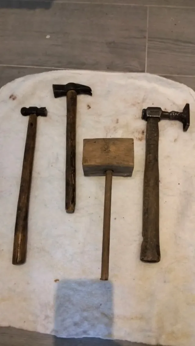 Conjunto de cuatro herramientas manuales antiguas. - Incluye martillos de diferentes tamaños y formas. - Mango de madera en buen estado.