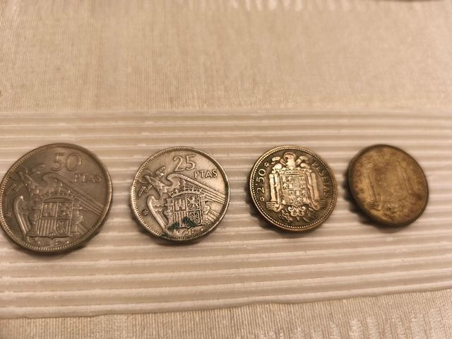 Detalles del productoConjunto de cuatro monedas antiguas de pesetas españolas.