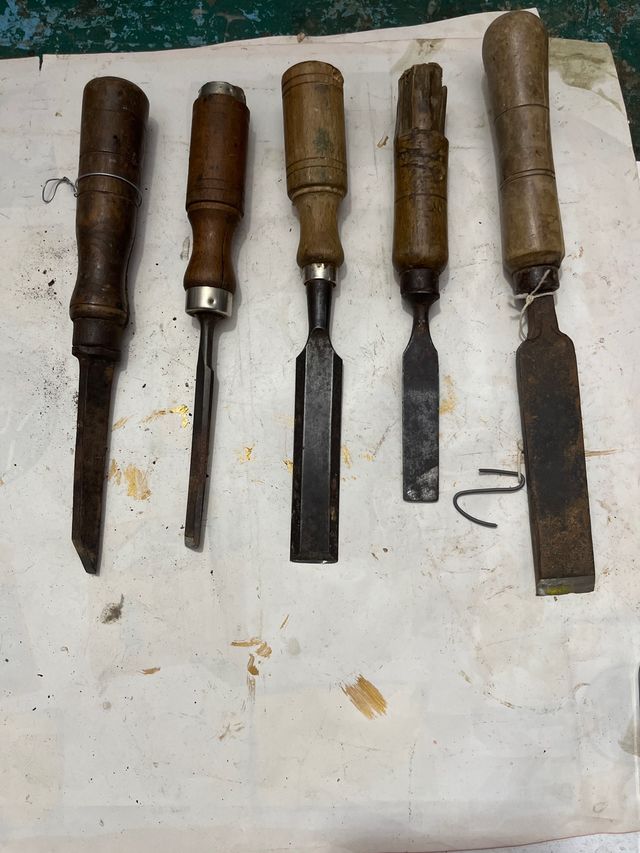 Buen estadoDetalles del productoConjunto de cinco formones de carpintería con mangos de madera. Herramientas clásicas para trabajos en madera.