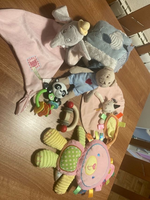 - Incluye un sonajero de madera, un dudu de Dumbo, un peluche de oso, un peluche de conejo con distintas texturas y estimulos, un sonajero y mordedor de panda de Fisher Price, un dudu de raton de Moulin Roty y cubo sensorial de Little Dutch.