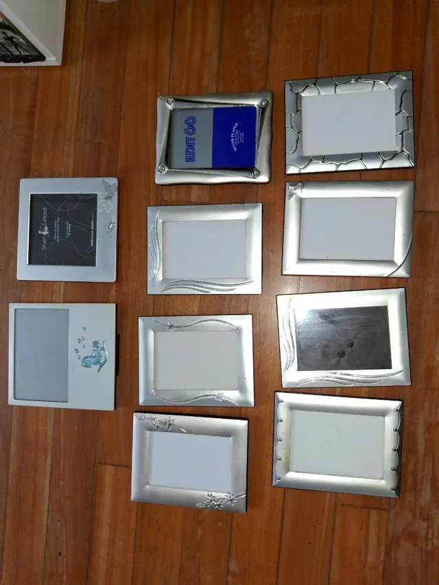 Detalles del productoConjunto de nueve marcos de fotos con acabado plateado, ideales para decorar cualquier espacio.