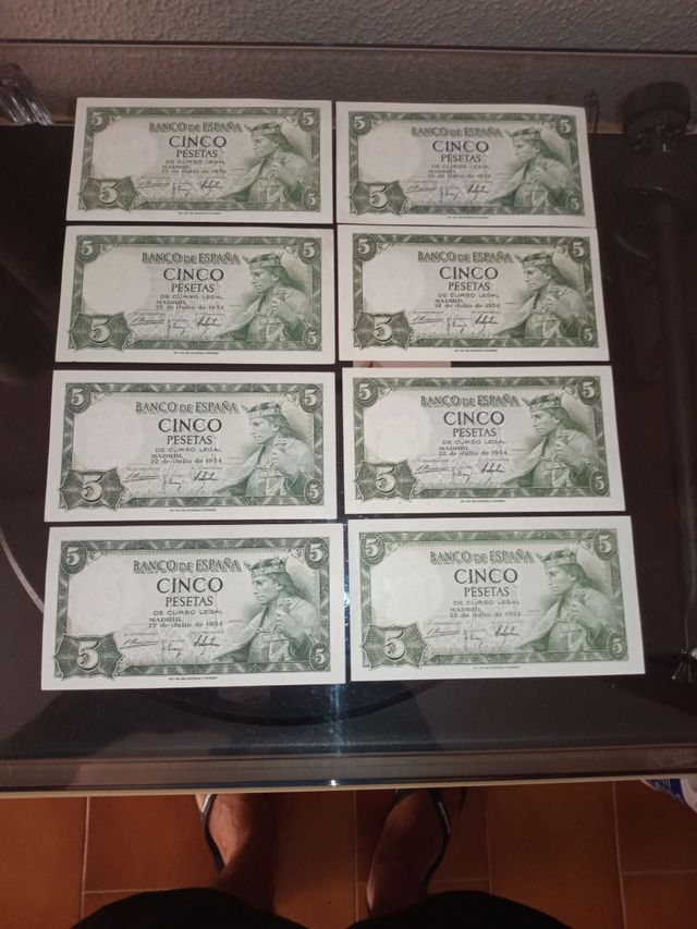 Lote de 8 antiguos billetes de 5 pesetas de 1954. Buen estado general.
