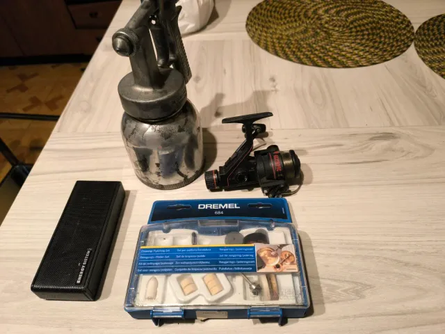 Detalles del productoSe vende un lote de artículos variados que incluye una pistola de pintura, un carrete de pesca, un altavoz y un set de accesorios Dremel.