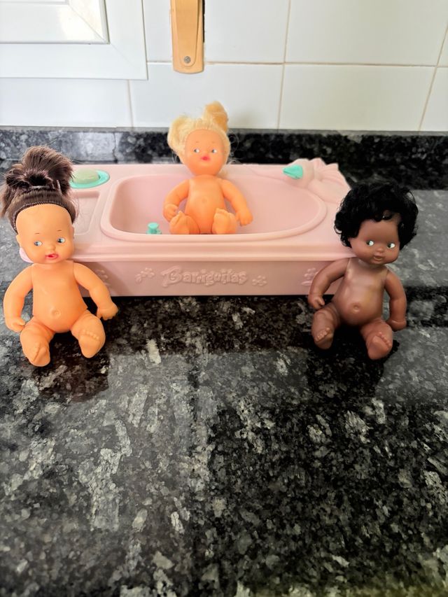 Vendo este lote compuesto por tres muñecas Barriguitas y una bañera de los años 80. Está todo en perfecto estado lo vendo como se puede apreciar en las fotos.