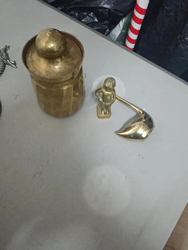 Conjunto de piezas decorativas de bronce. - Jarra o recipiente con tapa. - Figura de niño con cisne.