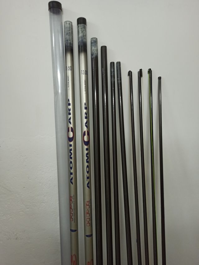 1. Cañas enchufable de 13.5 metros carbono COLMIC CARP. Con 4 kits montados con elásticos. 2 tramos los que siguen a los kits. Con fundas para caña y kits. Y funda para todo.