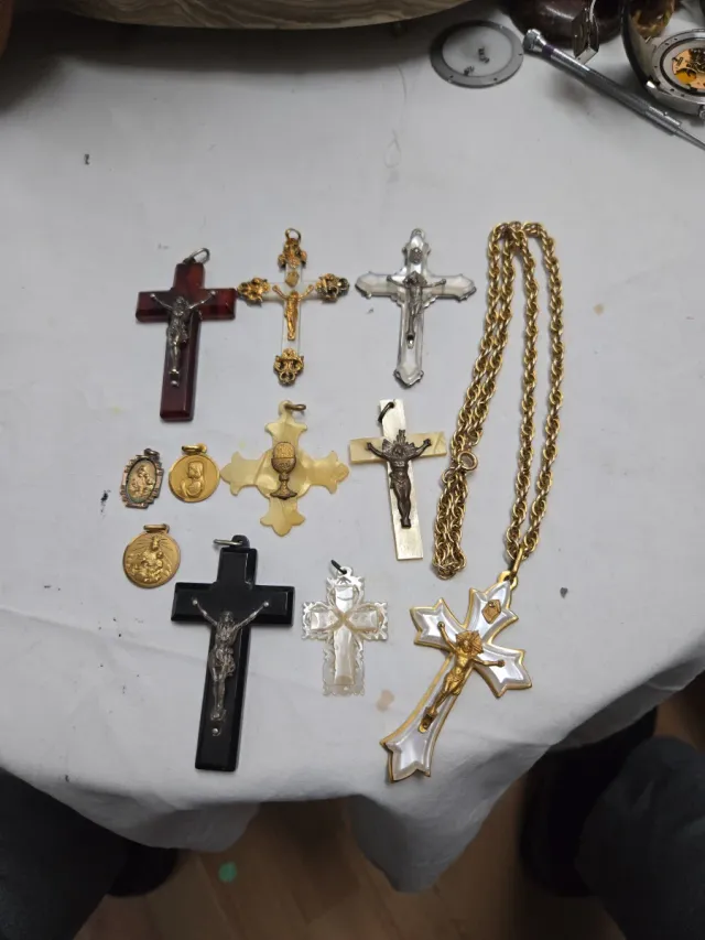 Detalles del productoConjunto variado de cruces y medallas religiosas, perfectas para coleccionistas o devotos.