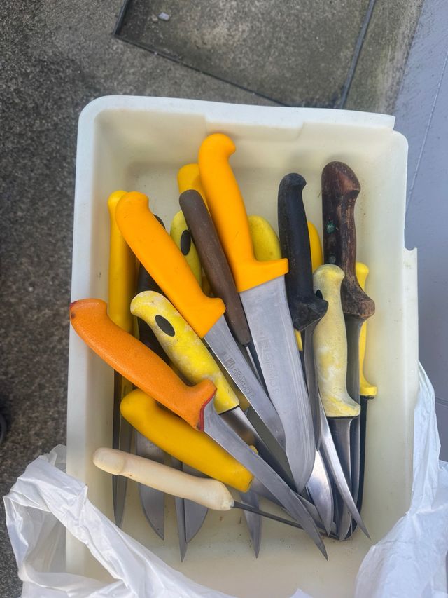 Conjunto de cuchillos de cocina con mangos de diferentes colores. - Mangos de plástico amarillo y naranja. - Mangos de madera y negro. - Hojas de acero inoxidable.