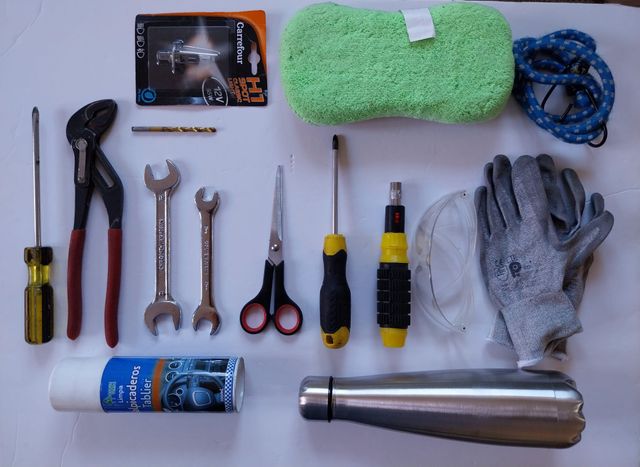 Tijeras; Destornillador Plano; Bombillas H1 Carrefour Nuevas; Guantes de Protección; Esponja & Gamuza Lavado Coche.