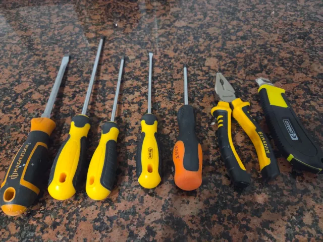 Detalles del productoConjunto de herramientas manuales variadas, incluyendo destornilladores y alicates.