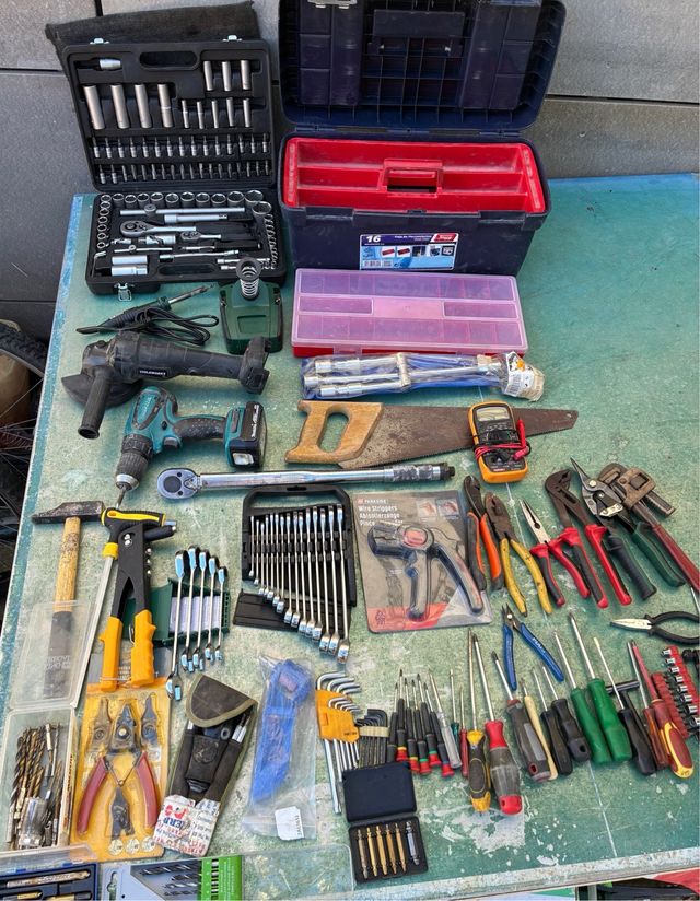 Detalles del productoAmplio lote de herramientas, radial, atornillador taladro Makita y accesorios para todo tipo de trabajos.