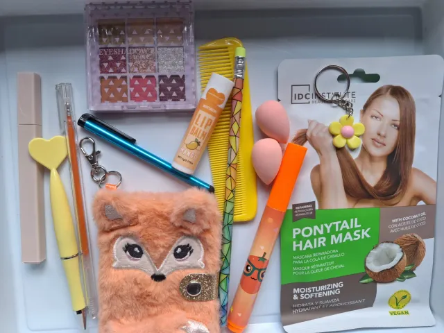Detalles del productoConjunto variado de artículos de belleza y papelería.