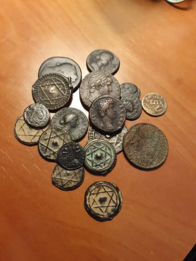 Detalles del productoConjunto de monedas antiguas de diferentes épocas y orígenes. Algunas presentan grabados de figuras y símbolos.