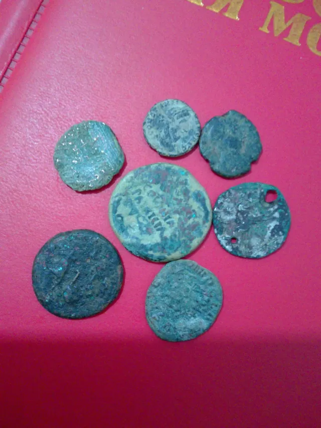 Detalles del productoConjunto de varias monedas antiguas con signos de desgaste por el paso del tiempo.