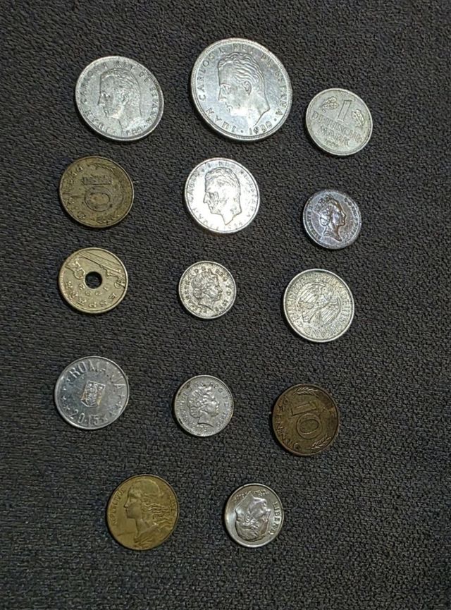 Conjunto variado de monedas de diferentes países y épocas. - Monedas con diseños y retratos. - Algunas monedas presentan agujeros centrales. - Diversos acabados metálicos.