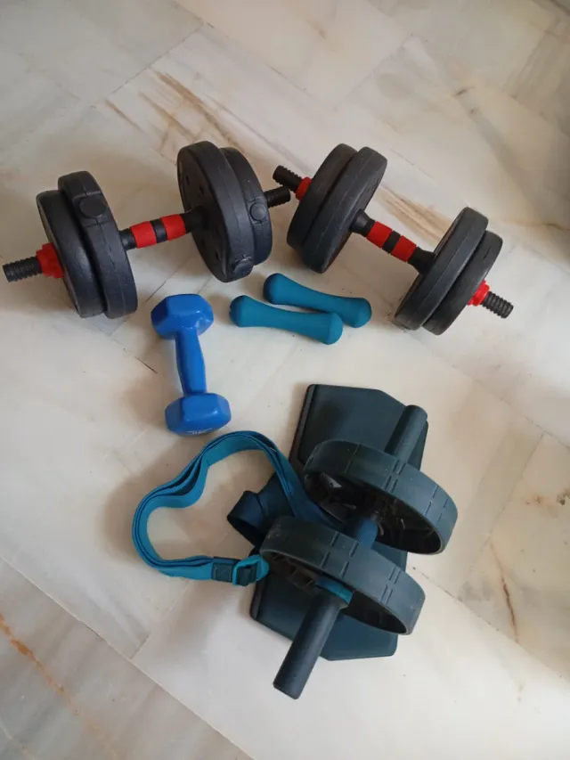Lote de pesas y accesorios fitness