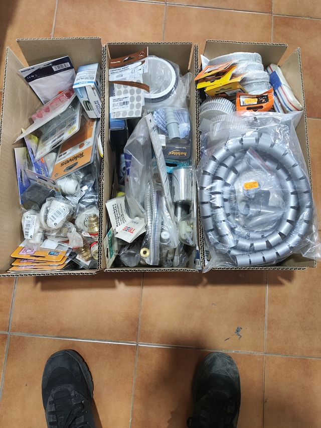 Se vende lote de piezas de ferretería, agua, electricidad, antena, desague, persianas, pomos, perchas, etc. 125 unidades.