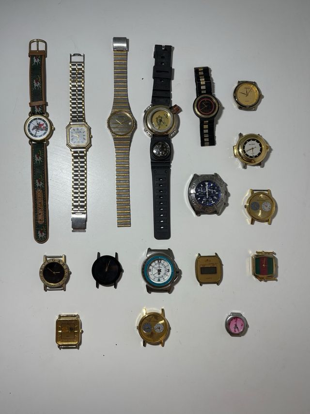 Detalles del productoColección de 17 relojes de diferentes estilos y marcas. Algunos presentan correas de cuero y metal, otros de plástico. Ideales para coleccionistas o para uso diario.