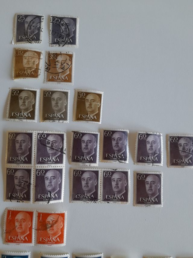 Lote de 37 sellos diferentes valores General Franco, año 1955. 25 cts./30 cts./50 cts./60 cts./1 pta./3 ptas./5 ptas./12 ptas./ Usados