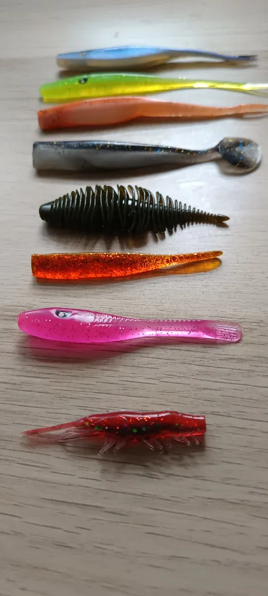 Detalles del productoConjunto de 8 señuelos de pesca de diferentes colores y formas.