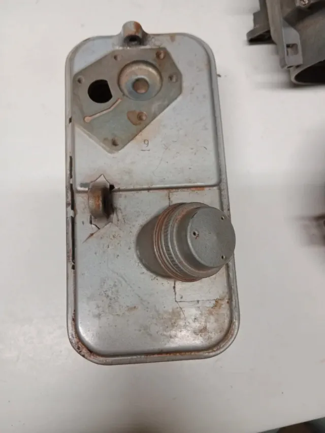 Se vende depósito y focos de Lote. El artículo es de metal y tiene un acabado grisáceo. - Depósito rectangular con tapa. - Dos focos circulares en la parte superior.