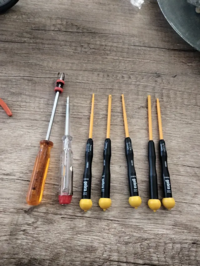 Conjunto de destornilladores de precisión. - Mango naranja. - Mango transparente con detalle rojo. - Cinco destornilladores con mango negro y punta amarilla.
