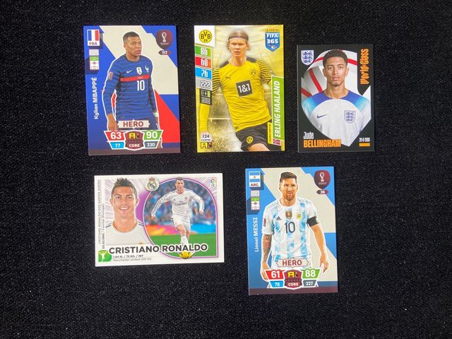Detalles del productolote de 5 cromos de Messi, Haaland, Cristiano, Mbappe y Bellingham.