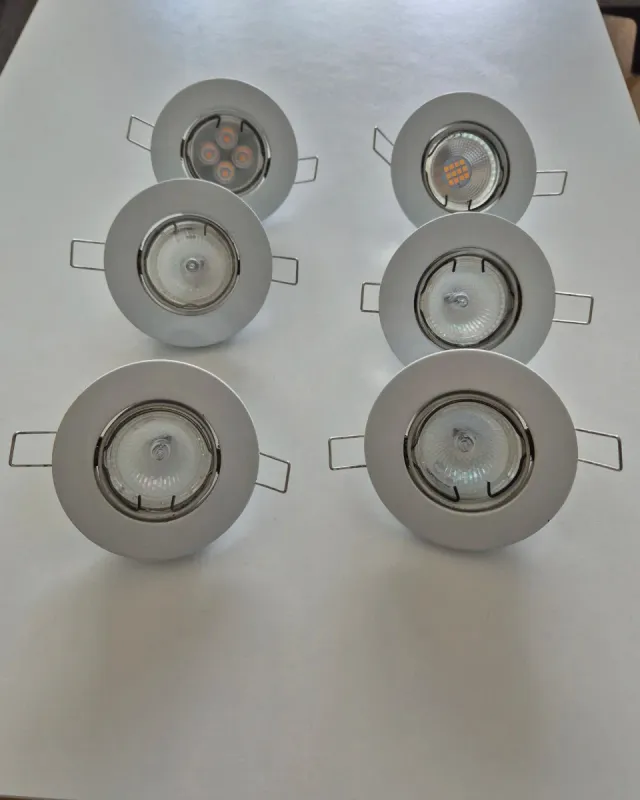 Detalles del productoLote de 6 focos empotrables halógenos en color blanco, con sus 6 transformadores LOYJE originales incluidos.