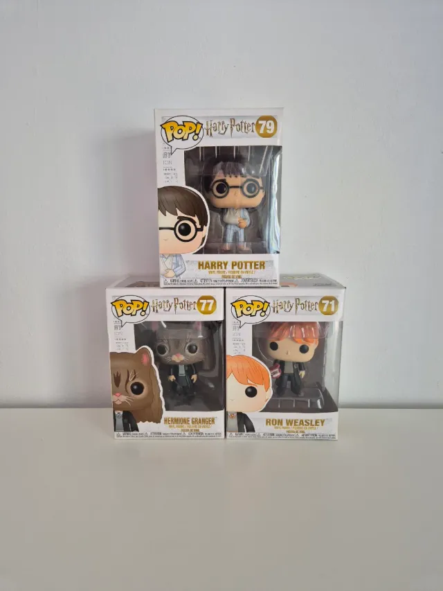 Lote de tres figuras Funko Pop de la saga Harry Potter. - Funko Pop Harry Potter #79. - Funko Pop Hermione Granger #77. - Funko Pop Ron Weasley #71.