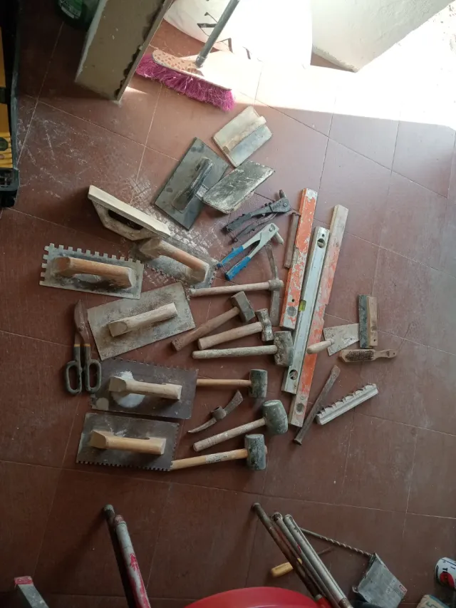 Detalles del productoConjunto variado de herramientas para trabajos de construcción y albañilería.