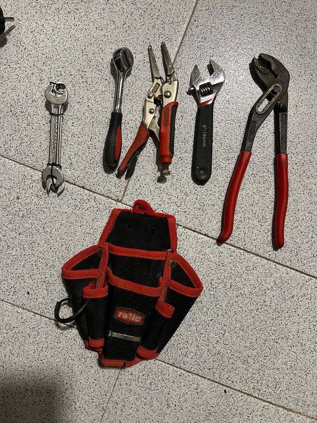 Detalles del productoConjunto de herramientas manuales variadas, incluyendo una llave de carraca, alicates de presión, una llave inglesa ajustable y una llave de tubo.