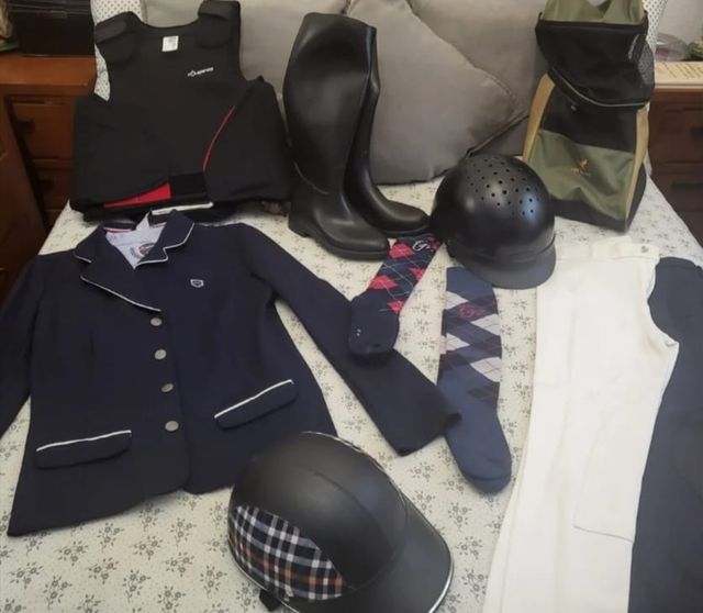 Detalles del productoSe vende estupendo lote de hípica - equitación compuesto de ropa y accesorios. Su estado es como nuevo dado su mínimo uso. Este excelente lote se compone de: 1 portabotas, 1 botas t-37, 2 juegos de calcetines 35-38, 2 pantalones t-14, 1 chaqueta t-36, 1 chaleco articulado t-16 años, 1 casco estampado t-universal y de REGALO 1 casco negro liso t-M (55-58 cm). Excelente lote para principiantes.