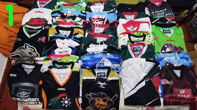 1. Unas 50 camisetas variadas Hockey, talla L, XL, 2XL y 3XL y alguna pequeña. PEDIR POR AQUÍ MÁS INFORMACIÓN DE TALLAS.