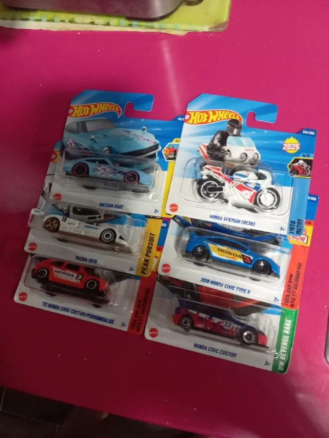 Conjunto de vehículos Hot Wheels. - Datsun 240Z - Mazda 7878 - 73 Honda Civic Custom - Honda VFR750R (RC30) - 2018 Honda Civic Type R