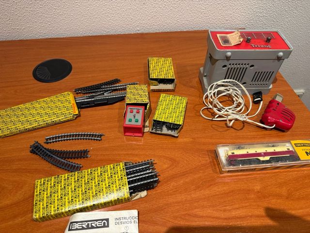 Detalles del productoSe vende lote de artículos Ibertren para modelismo ferroviario. El lote incluye varios tramos de vía, 1 mandos para desvíos, una locomotora y su caja, y una pequeña central eléctrica. Las cajas muestran señales de uso y desgaste propios del tiempo, pero los artículos están en buen estado general. - Varios tramos de vía Ibertren.