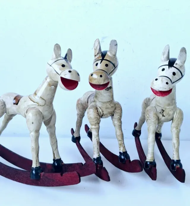 Detalles del producto3 caballitos madera balancin según imágenes. También los vendo sueltos en otro anuncio. Juguete español antiguo, posible Goula o Denia. 17x15 cms aprox. Ver fotos como mejor descripción.
