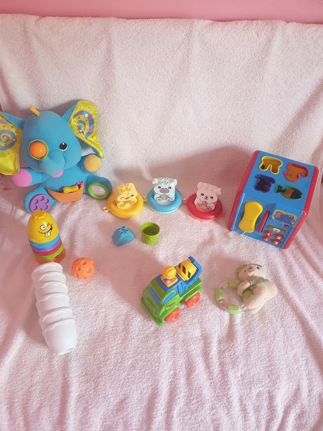 Detalles del productoCompleto lote de juguetes para bebé. Compuesto de un peluche actividades de elefante de playskool, unos muñecos para el baño, un sonajero, un cochecito, un juego de bolos, una caja con piezas completa aunque el sonido no funciona, un topo que canta y un carrusel de bolas. Está todo bastante bien.
