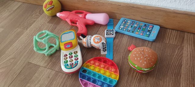 - Incluye pistola de agua, teléfono de juguete, reloj inteligente, mordedor, BB-8, hamburguesa de peluche y un juguete sensorial.