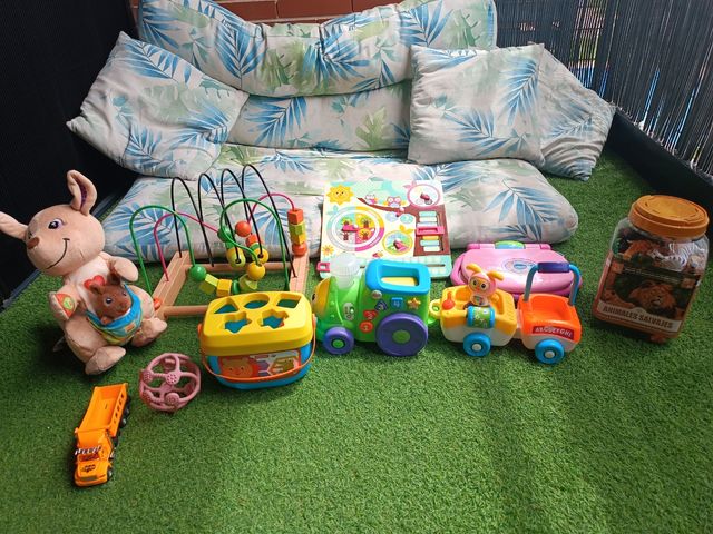 Detalles del productoSe vende lote de juguetes para bebés en buen estado. Incluye un ordenador rosa, un tren de juguete y un tierno canguro de peluche. Son ideales para el desarrollo de los más pequeños.