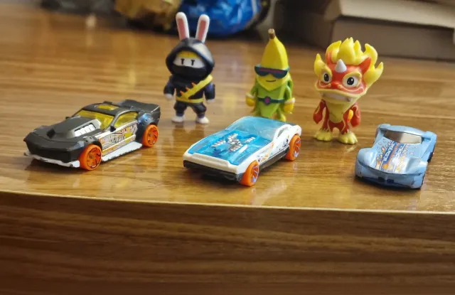 Conjunto de juguetes que incluye varios coches y figuras. - Coches de juguete con detalles. - Figuras de personajes variados.