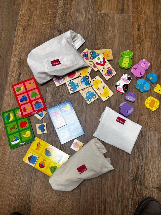 Detalles del productoLote de juguetes de madera de la marca Goula. Incluye varias piezas de madera con diferentes diseños. (Todos con material completo).