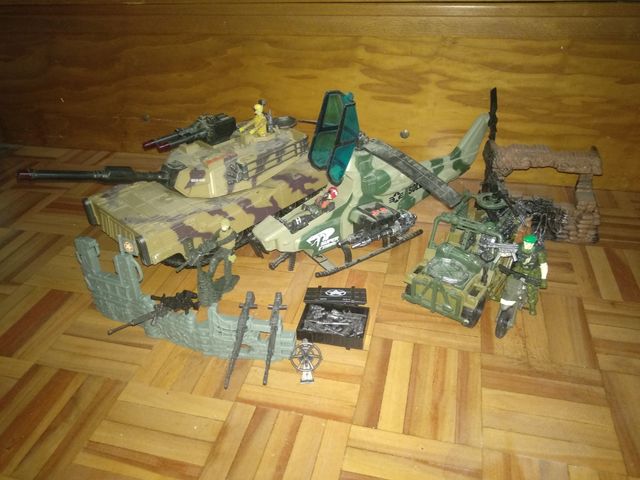 Detalles del productoSe vende lote de juguetes militares tamaño grande. Incluye un tanque (con botones de sonido, un helicóptero ( con botones de sonidos), un todoterreno Jeep y una moto de vehículos militares, varias figuras de soldados y muchas armas distintas (granadas, escopetas,pistolas,cuchillos y ametralladoras) junto con más accesorios(mochilas, muros de paredes y ). Los juguetes están en buen estado y los muñecos son articulados .Puedo regalar algunos muñecos mas que tengo de soldados si lo desean.Precio algo negociable y gastos de envio no incluidos.