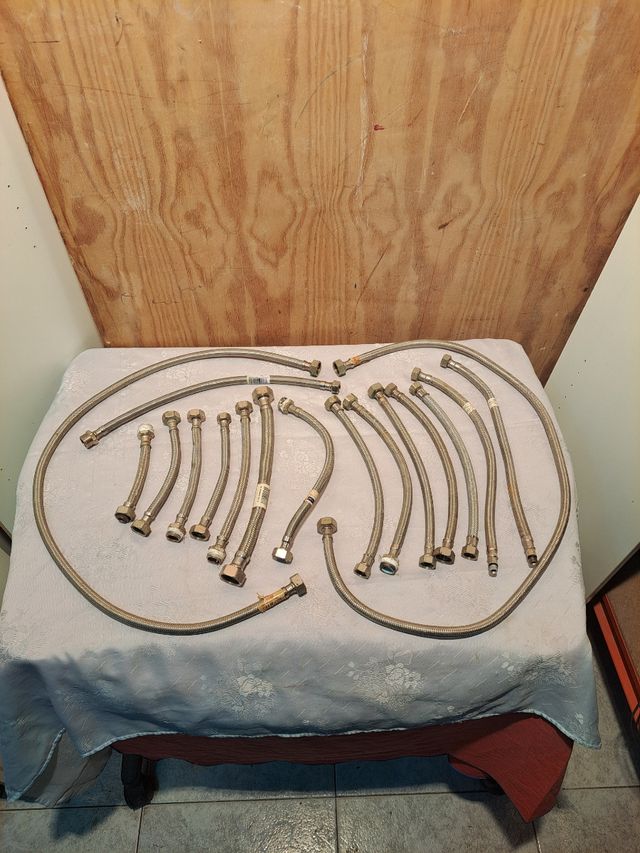 Lote de 17 latiguillos de varias medidas, trenzados para grifos y fontanería en general.