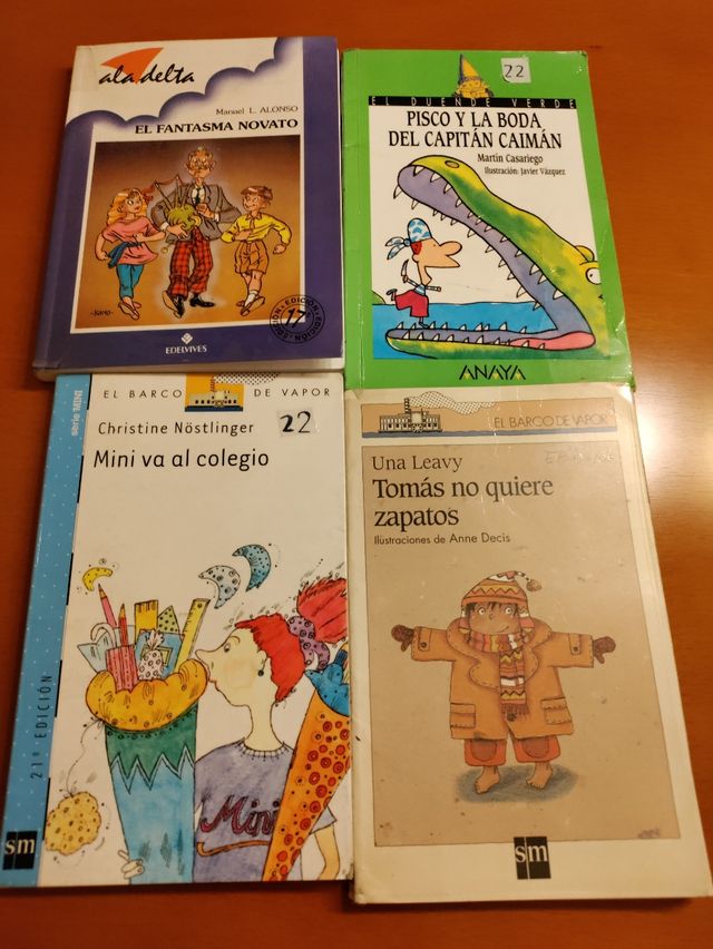 4 libros para niños de edades de 6 a 9 años. -Pisco y la boda del capitán caimán. -El fantasma novato. -Mini va al colegio. -Tomas no quiere zapatos.