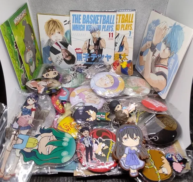 Lote variado de artículos de merchandising de anime japonés. - Incluye figuras, llaveros, chapas y más. - Diseños inspirados en series populares.