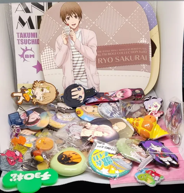 Lote variado de artículos de merchandising de anime japonés. - Incluye llaveros, figuras y pines. - Diseños inspirados en personajes de anime.