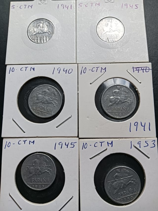 - Monedas de 10 céntimos de 1940, 1941, 1945 y 1953.