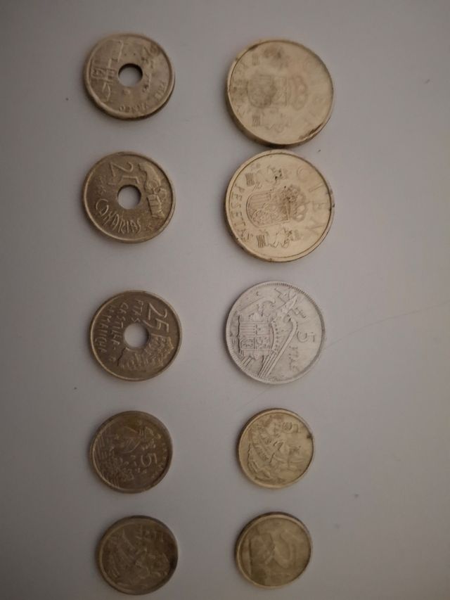 Conjunto de monedas antiguas españolas. - Monedas con agujero central. - Diseños variados.