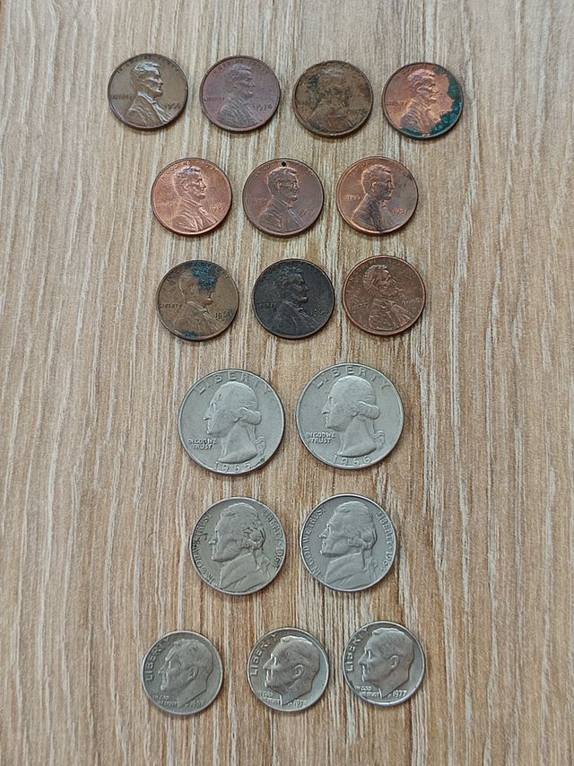 Detalles del productoSe incluye: 1/4 dolar 1965 y 1966; 5 céntimos 1964 (2); 1 dime (10 centavos) 1967, 1975 y 1977; 1 céntimo 1968, 1974, 1975, 1976, 1985 (2), 1987; 1 céntimo 1961, 1964, 1990. Si están interesados en más lotes de monedas o billetes, tengo más en mi perfil, no duden en preguntar!