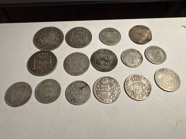 Conjunto de monedas españolas de plata con diversos escudos y leyendas. - Material: Plata. - Diseño: Escudos reales y coronas. - Variedad de acuñaciones.